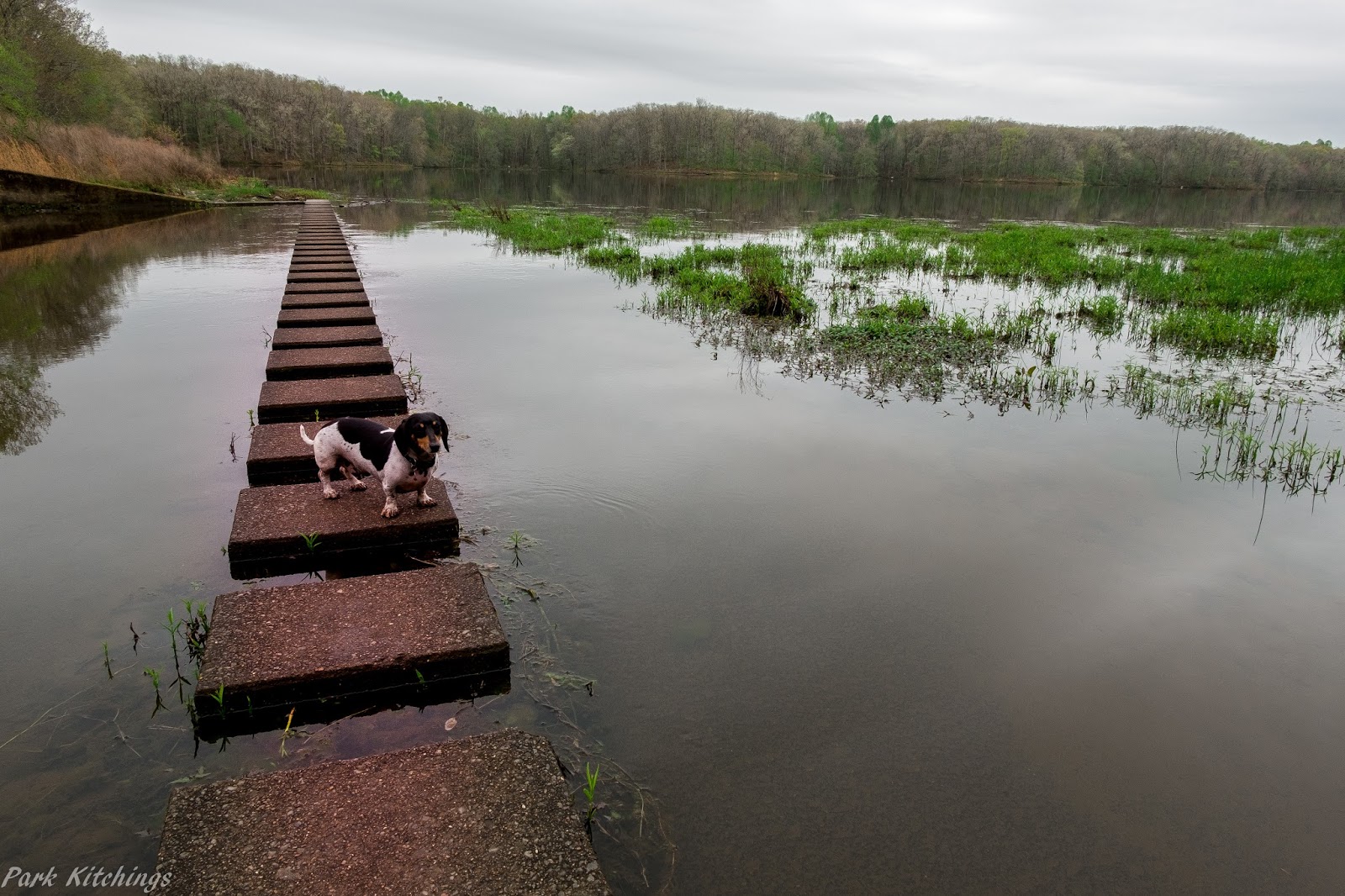Spillway crossing near camp one night. With a major pause between each jump it took Petey forever to work his way across. I finally went out and rescued him.